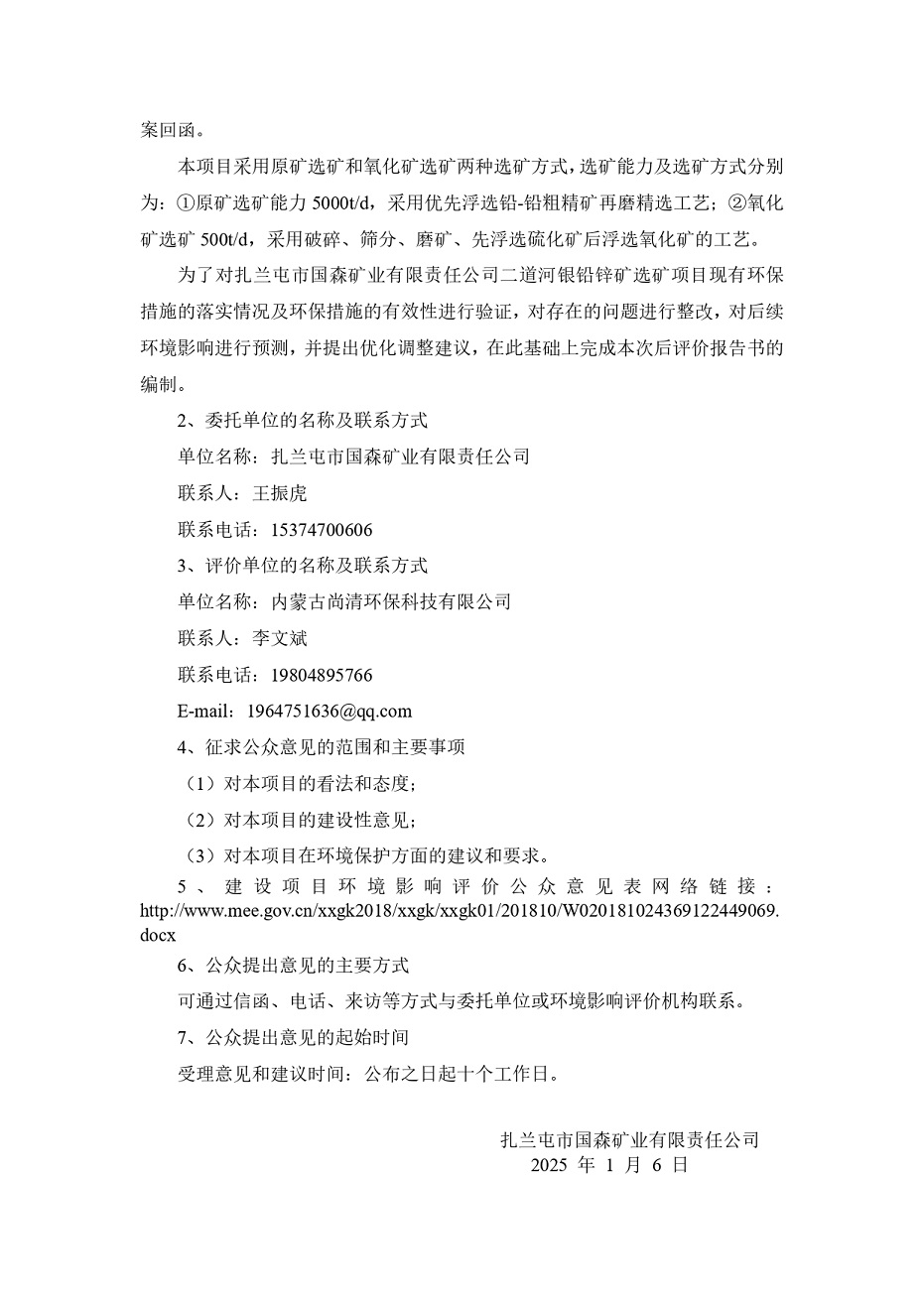 《扎蘭屯市國森礦業有限責任公司二道河銀鉛鋅礦選礦工程環境影響后評價報告書》公眾參與第一次公示